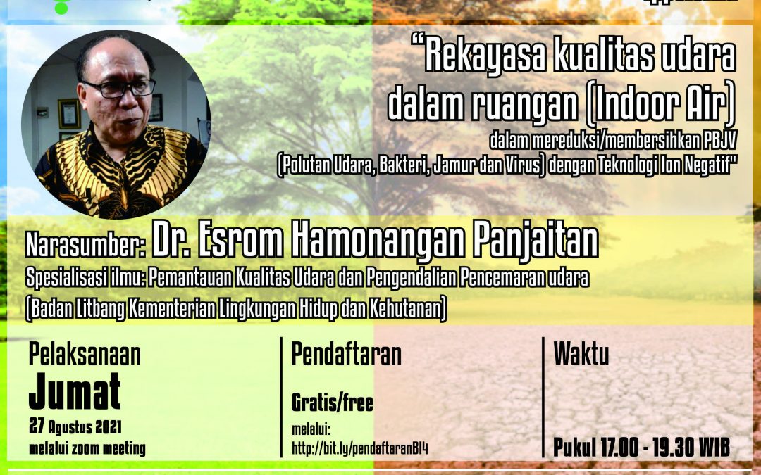 Udara merupakan unsur penting dalam kehidupan. Ada beberapa parameter dalam udara yang dapat mempengaruhi kesehatan. Salah satunya adalah polusi udara. Polusi bukan saja menyerang kesehatan fisik namun juga kesehatan mental. Timbal, karbon monoksida dan debu adalah zat di udara yang berbahaya. Jika udara tercemar, apakah kita akan diam saja, sementara udara merupakan unsur penting bagi kehidupan? Sebagai umat Allah, kita tidak boleh diam. Harus ada tindakan nyata untuk memulihkan udara dari pencemaran. DR. Esron Hamonangan Panjaitan, seorang pakar dari Bidang Litbang Kementerian Lingkungan Hidup dan Kehutanan dengan spesialisasi pemantauan kualitas udara dan pengendalian pencemaran udara akan membagikan ilmunya kepada sahabat-sahabat LPP Sinode GKJ dan GKI SW Jateng dalam acara berbagi ilmu. Tema berbagi ilmu ke-4 adalah: Rekayasa Kualitas Udara dalam Ruangan (Indoor Air) dalam mereduksi/membersihkan PBJV (Polutan Udara, Bakteri, Jamur dan Virus) dengan Teknologi Ion Negatif.