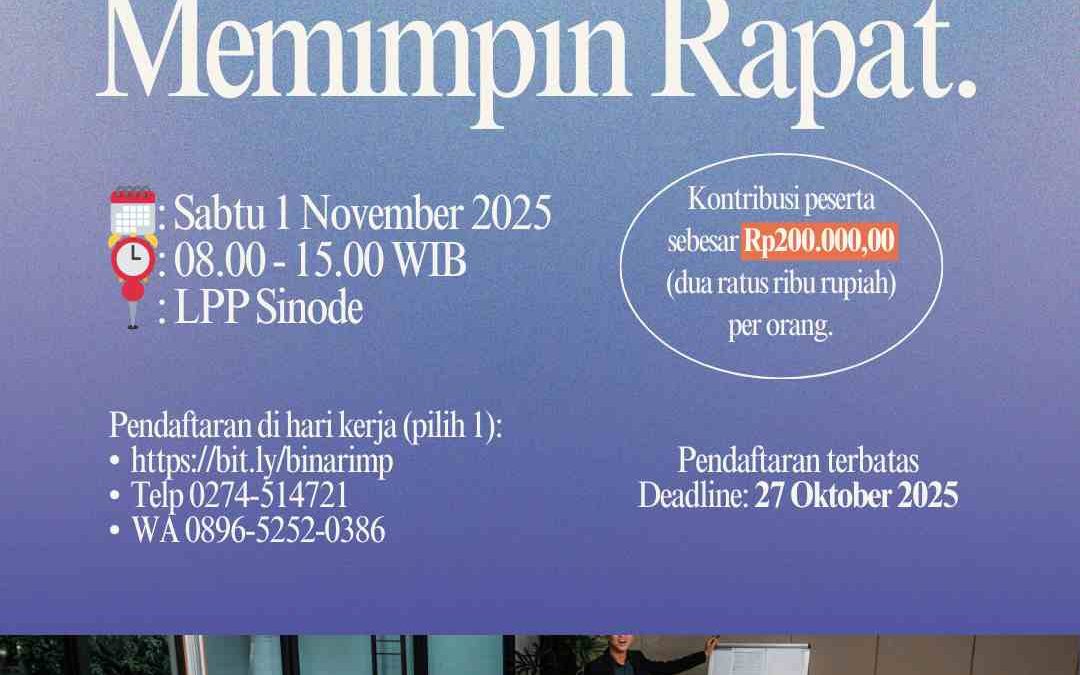 Gereja sebagai persekutuan umat Allah mewujudkan karya Allah melalui persekutuan, kesaksian, dan pelayanan. Guna mewujudkan panggilan tersebut, persekutuan umat Allah melakukan aneka koordinasi di dalam persekutuannya sendiri, maupun bersama dengan komunitaskomunitas lainnya. Rapat atau persidangan gerejawi menjadi sarana penting untuk melakukan koordinasi, mengambil keputusan, serta menyelesaikan aneka permasalahan yang dihadapi. Amat disayangkan bila rapat yang berlangsung tidak menjadi sarana koordinasi, mengambil keputusan, serta tidak mampu menyelesaikan masalah karena rapat tidak berlangsung dengan baik. Ada aneka penyebab yang membuat rapat tidak dapat berlangsung dengan baik. Supaya rapat berlangsung dengan baik diperlukan kepemimpinan yang mumpuni. Atas dasar pemikiran tersebut, LPP Sinode mengadakan pembinaan sehari (Binari) memimpin rapat.